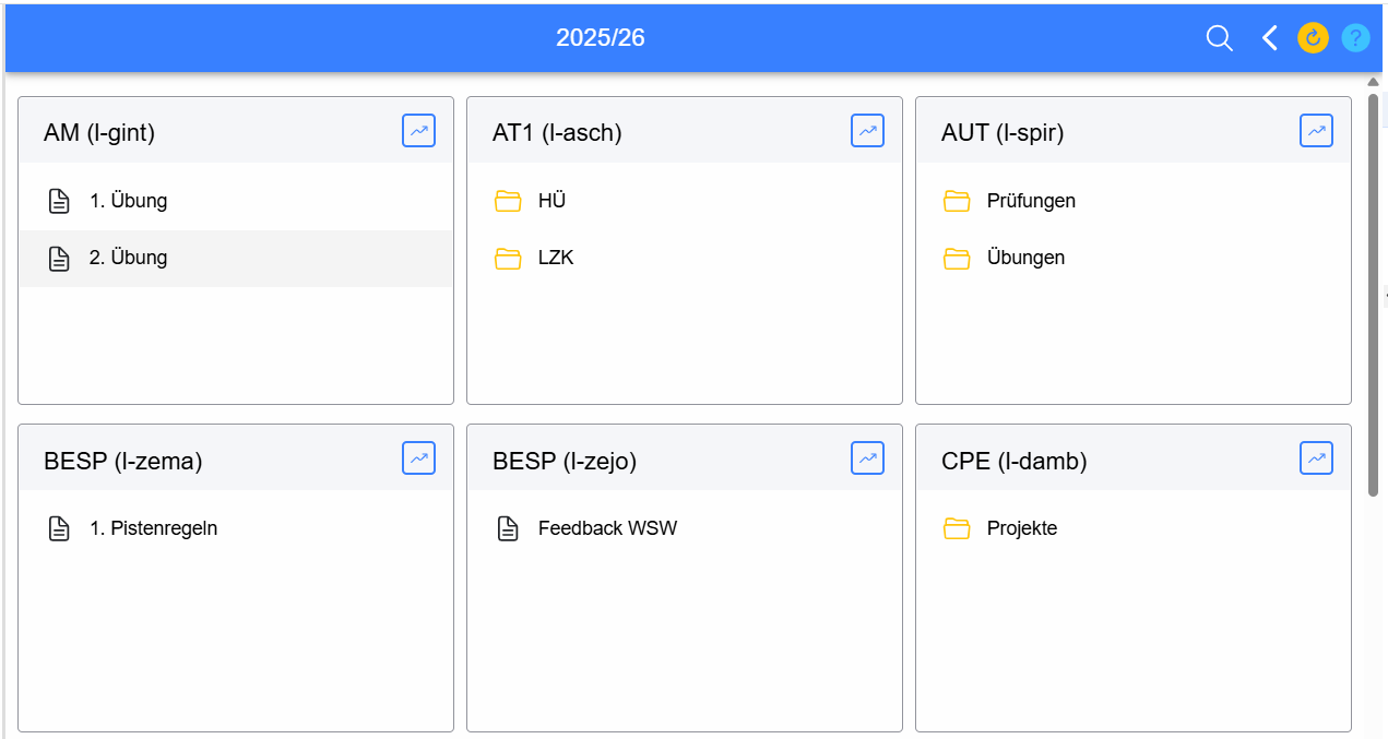 Diese Ansicht bietet eine Übersicht über alle für diese Klasse bereitgestellten Lernmaterialien (Aktivitäten), ähnlich einem Kurs in MOODLE.